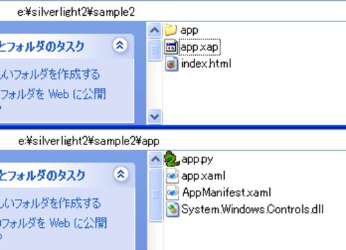 Silverlight SDK 2.0 Beta1 を使って IronPython を使った簡単なサンプルを作ってみた。手順は以下の通り。 app ディレクトリ作成 app.xaml 作成 app.py 作成 chiron.exe による app.xap 生成 index.html 作成 なお、Silverlight SDK 2.0 Beta1 では IronPyt…